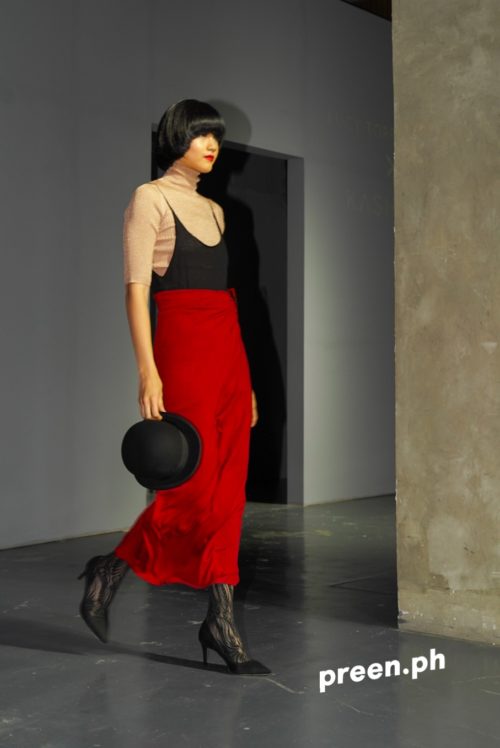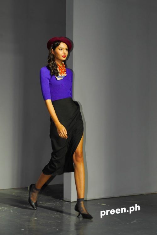 The show started with Kashieca’s collab with Lucy Torres-Gomez, which gave us Parisian vibes and a glimpse at Lucy’s chic style. The pieces included ankle-length skirts that were either straight-cut or had a slit on the side, 3/4-sleeved tops, and even ascots.
