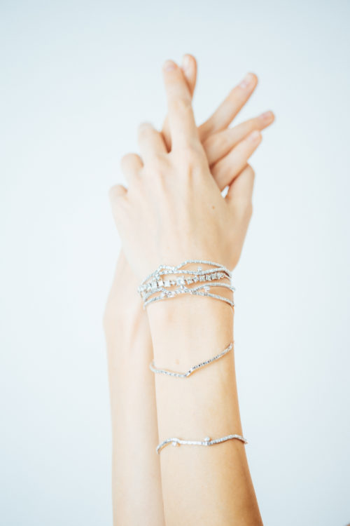 Aptly named “Cristal,” Paul says he took inspiration from a crystal’s “form and what you find inside.” He tells us this as he turns the pages of his gemology book (fun fact: he’s a trained gemologist) to show us the clean crystalline structure of various gemstones. “I was trying to make [the pieces] like a crystal because it looks so light, more feminine, and bright,” he says.